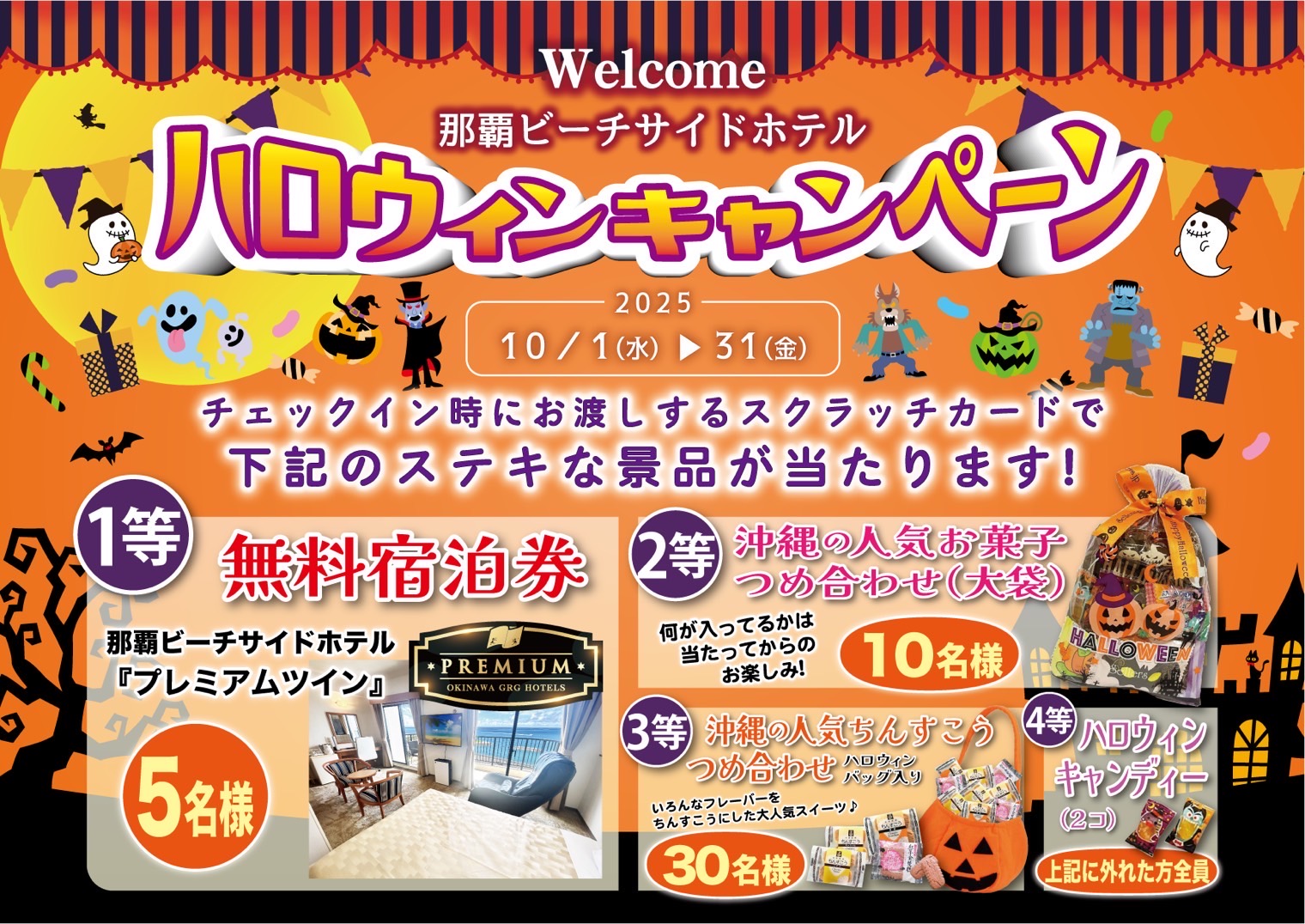 この機会に那覇ビーチサイドホテルをご利用いただき、豪華景品とハロウィンの楽しい思い出をゲットしてください!